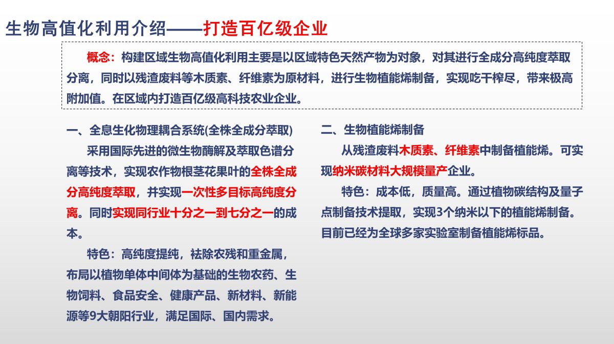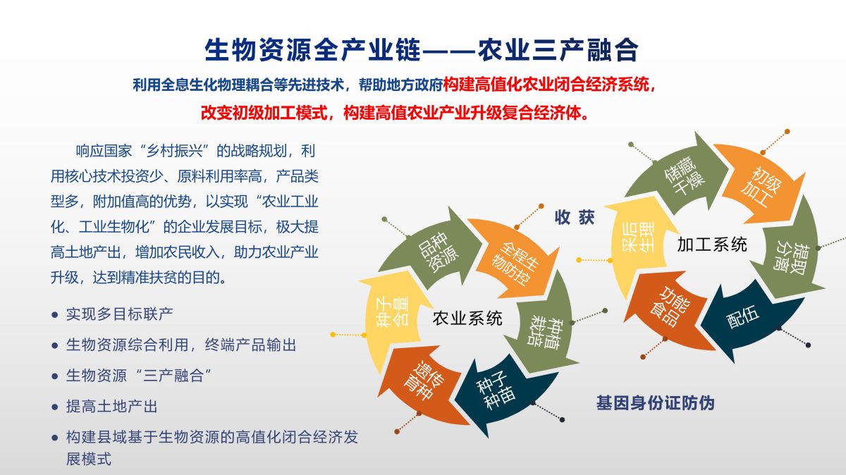 The whole industry chain of biological resources in the closed system of county economy - the integration of the three industries of agriculture. Using advanced technologies such as holographic physical coupling, we help local governments build a high-value agricultural closed economic system, change the primary processing model, and build a high-value agricultural industry upgrading complex economy. In response to the national strategic plan of "rural revitalization", we use the advantages of low investment in core technology, high raw material utilization, multiple product types, and high added value to achieve the corporate development goals of "agricultural industrialization and industrial biotechnology", greatly improve land output, increase farmers' income, help upgrade the agricultural industry, and achieve the purpose of targeted poverty alleviation. Realize the comprehensive utilization of multi-target joint production of biological resources, and the terminal product output biological resources "three-industry integration" to increase land output and build a county-level high-value closed economic development model based on biological resources.