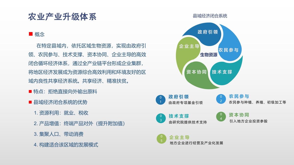 In a specific county, relying on regional biological resources, we will realize an efficient closed-loop economic system led by the government, participated by farmers, supported by technology, coordinated by capital, and dominated by enterprises. We will form enterprise clusters through the whole industrial chain platform and develop the regional economy into a benign shared economic system in the region with comprehensive and efficient utilization of resources and environmental friendliness. Sharing economy and targeted poverty alleviation.